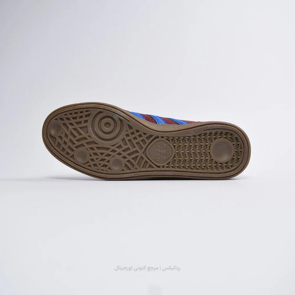 • رنگ‌بندی جگری تیره با سه خط آبی و جزئیات طلایی، ظاهری نمادین و کاملاً کلاسیک به کفش بخشیده است.
